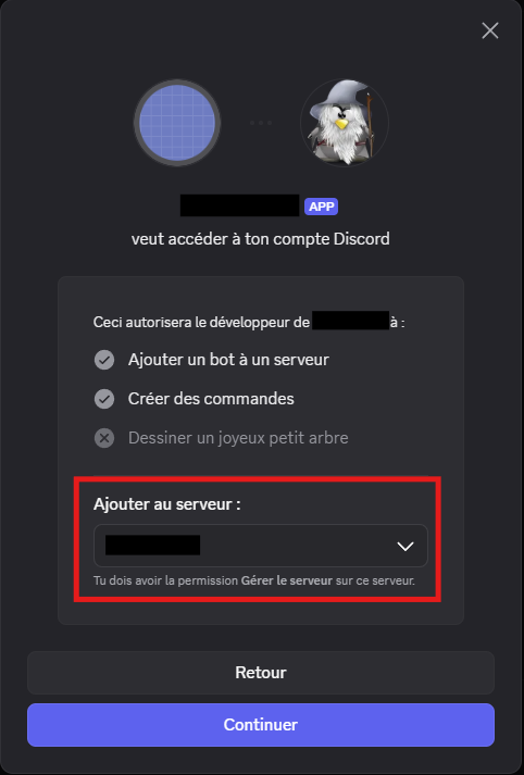 6 - Choisissez le serveur auquel ajouter votre Bot, et cliquez sur le bouton Continuer