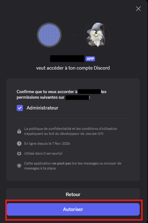 7 - Vérifier les permissions accordées au Bot sur ce serveur, et cliquez sur Autoriser