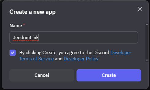 4 - Entrez un nom pour votre Bot, cochez la case pour accepter les conditions d’utilisation et cliquez sur “Create”.