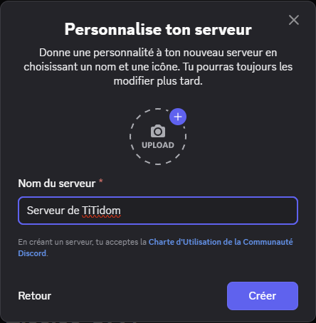 4 - Personnalisez le nom du serveur et son avatar, puis cliquez sur le bouton “Créer”