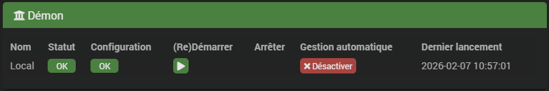 Cette partie permet de valider l’état actuel du démon du plugin et de configurer la gestion automatique de celui-ci.