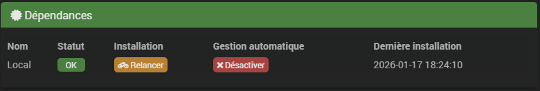 Si l’installation des dépendances n’a pas démarré automatiquement après l’installation du plugin, cliquez sur le bouton “Relancer” et attendre la fin de l’installation des Dépendances.