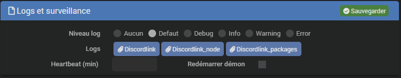 Discordlink : logs du plugin (Jeedom)Discordlink_node : logs du démon (NodeJS)Discordlink_packages : logs d’installation des dépendancesA chaque version du plugin qui sort, un numéro est attribué sous la forme version_majeure.version_mineure.version_patch (par ex. : “2.2.0”). Vous pouvez retrouver cette information sur la page de configuration du plugin.