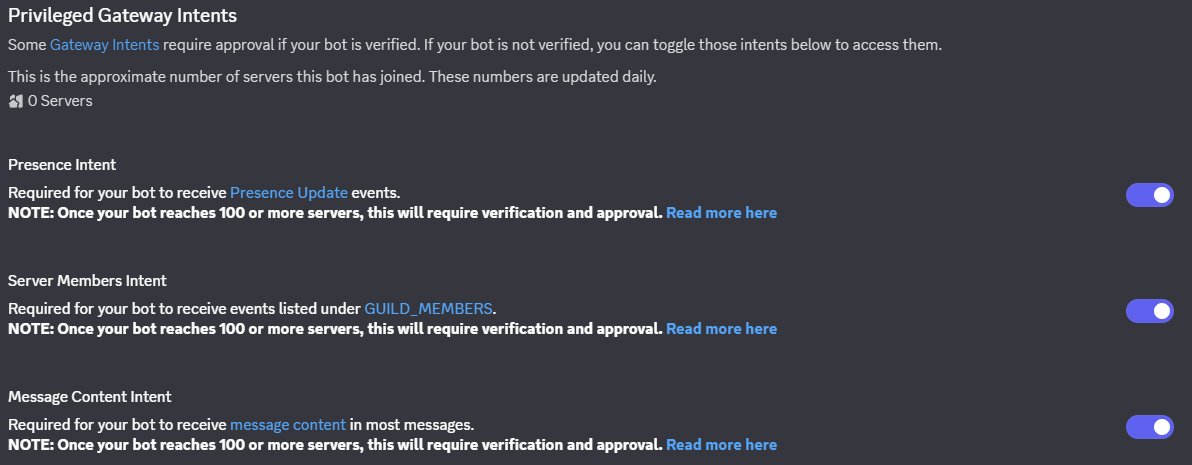 13 - Dans la section Privileged Gateway Intents, cochez les cases :