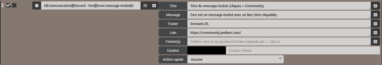Dans la commande Envoi message évolué, le champ Action rapide affiche une liste permettant de sélectionner l’action à executer via cette commande.